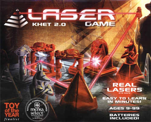 Khet (or as I like to call it, Egyptian Laser Chess), is a two player strategy game where the goal is to hit your opponent's pharaoh with your laser. You direct your laser by moving mirrored pieces around the board. The great thing about lasers is they don't discriminate, so you can take out your own pieces if you're not careful. I've had a lot a fun playing this, and there are iPhone and Android apps available that allow you to play against others or an AI.